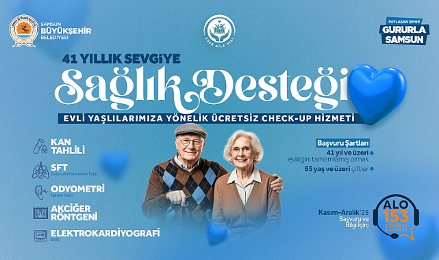 Hizmet kapsamında uzun yıllardır birlikteliğini sürdüren büyüklerin sağlıklı yaş almalarını desteklemek, evliliği devam ettirmenin önemini vurgulayarak farkındalık oluşturmak ve yaşlanma sürecinde karşılaşabilecekleri sağlık risklerini erken teşhis etmeyi amaçlıyor.Samsun Büyükşehir Belediyesi’nin öncülüğünde yürütülecek ücretsiz sağlık taramasında; kan tahlilleri, solunum fonksiyon testi (SFT), odyometri (işitme testi), akciğer röntgeni ve elektrokardiyografi (EKG) hizmetleri verilecek.Aralık ayında uygulanacak proje için başvurular ALO 153 Çözüm Merkezi üzerinden yapılacak. Başvuru şartları arasında vatandaşların 65 yaş ve üzeri olmaları ve 41 yıl ve daha uzun süredir evli bulunmaları yer alıyor.