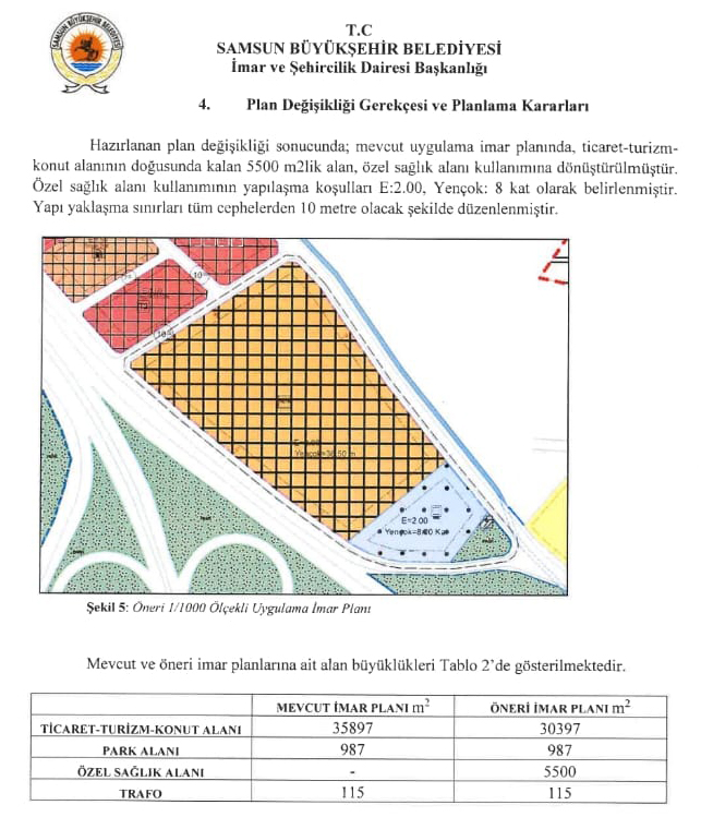 ‘ÖZEL SAĞLIK ALANI’ EKLENTİSİİhalenin iptal edilmesindeki neden ise, özel bir sağlık kuruluşunun mevcut alanın bir kısmına talip olmasından kaynaklandığı öne sürüldü. Bu hastanenin Acıbadem olduğu öğrenildi.37 bin metrekare alana sahip taşınmazın bir kısmının ‘Özel Sağlık Alanı’ olarak değiştirilmesi, Samsun Büyükşehir Belediyesi ekim ayı meclis toplantısının gündemine geldi. 27. gündem maddesi ilgili komisyona havale edildi.Mevcut imar planında 37 bin metrekare alana sahip taşınmazın 5 bin 500 metrekarelik alanının ‘Özel Sağlık Alanı’ olarak değiştirilmesi öngörülüyor. 30 bin 397 metrekarelik alanının yine "Ticaret-Turizm ve Konut" alanı olarak kalacak. DEĞİŞTİRİLMESİ ÖNGÖRÜLEN İMAR PLANI