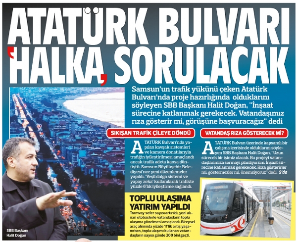 Samsun’un trafik yükünü çeken Atatürk Bulvarı’nda proje hazırlığında olduklarını söyleyen Samsun Büyükşehir Belediye Başkanı Halit Doğan, “Uzun sürecek bir işimiz olacak. Bu projeyi vatandaşlarımıza sormayı planlıyorum. İnşaat sürecine katlanmak gerekecek. Rıza gösterirler mi, göstermezler mi, önemsiyoruz” ifadelerini kullandı.