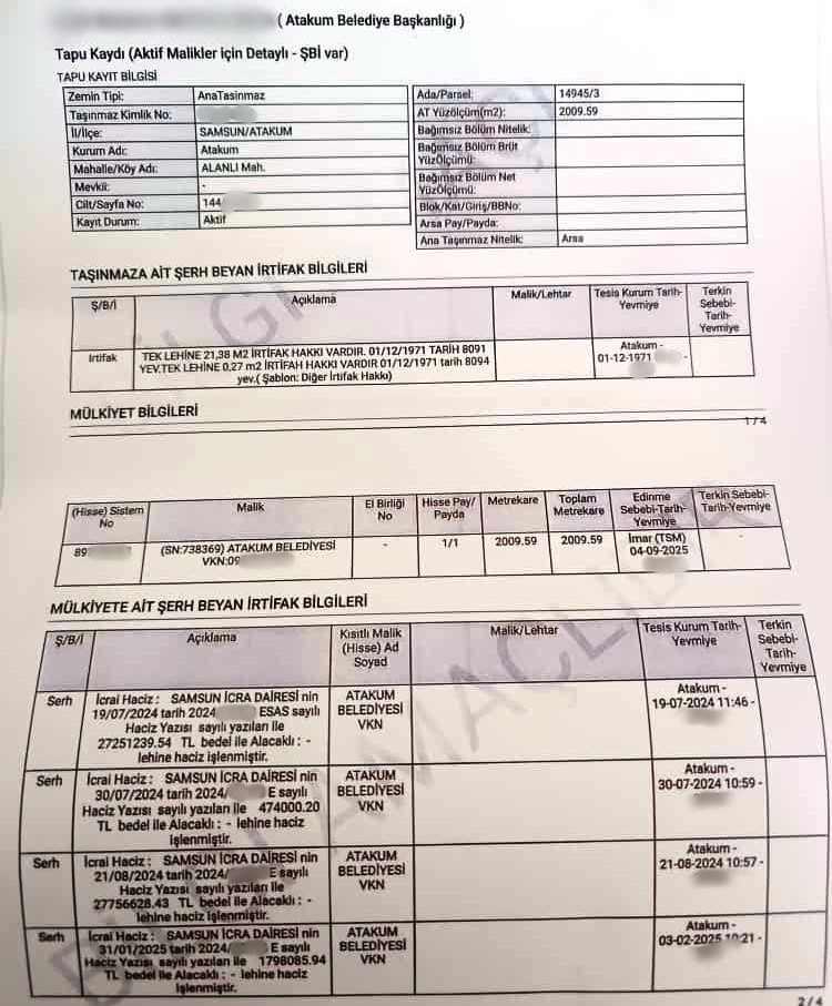 Atakum Belediye Meclisi'nin Ekim ayı toplantısında; mülkiyeti belediyeye ait Alanlı Mahallesi 14 bin 945 ada 3 parselde bulunan 2009 metrekarelik arsa vasfındaki taşınmazın satışı için belediyeye yetki verilmesi gündem maddesi görüşüldü.Üzerinde 200 milyon liranın üzerinde 10 adet icra haczi bulunan arsanın satış yetkisi için yapılan görüşme sırasında AK Parti ve CHP’li meclis üyeleri arasında tartışma yaşandı.AK PARTİ'NİN GEREKÇESİ: ‘BELİRSİZ YETKİ’Teklifin oylanması sırasında AK Parti Atakum Belediyesi Meclis Üyesi İsa Bozçelik, daha önce birçok arsa satışını onaylamış olmalarına rağmen, bu kez yöntemi etik bulmadıklarını belirtti. Arsa üzerinde yüksek haciz bulunduğunu ve satışın mümkün görünmediğini vurgulayan İsa Bozçelik, birinci oturumda bir Belediye Başkan Yardımcısı'nın kendilerine; "Bu yetkiyi alalım, ileride bir gün kullanılırız" dediğini savundu.