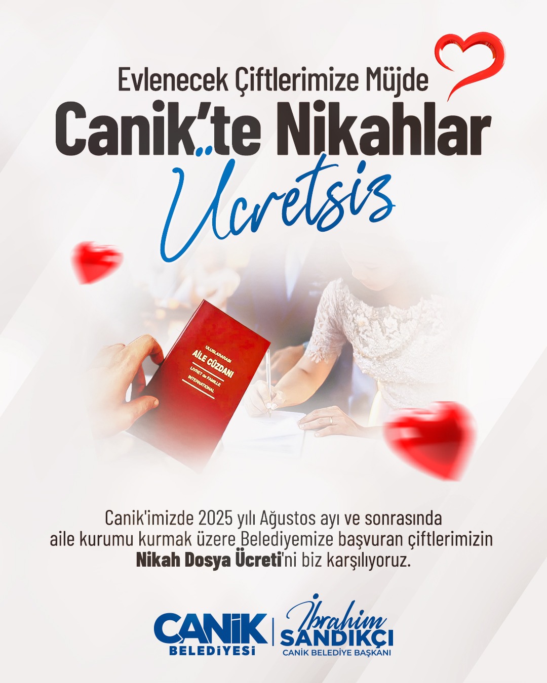 Canik Belediyesi, aile içi iletişimin ve toplumsal aile bağının güçlenmesini hedefleyen sosyal projelerle hem mevcuttaki ailelere hem de aile kurmaya hazırlanan gençlere destek oluyor.2025 Aile Yılı sosyal destek çalışmaları çerçevesinde ilçede çocuk sahibi olan ihtiyaç sahibi ailelere 5 bin Türk Lirası destek sağlayan belediye, aynı zamanda anne adaylarına ‘bebek destek paketi’ hediye ediyor. Aile kurmak üzere başvuran çiftlerden ise nikâh ücreti alınmıyor.Canik Belediye Başkanı İbrahim Sandıkçı, "Güçlü aile, güçlü toplum ve güçlü gelecek ilkesiyle 2025 Aile Yılı’na özel sosyal projeleri hayata geçirmeye devam ediyoruz” dedi.