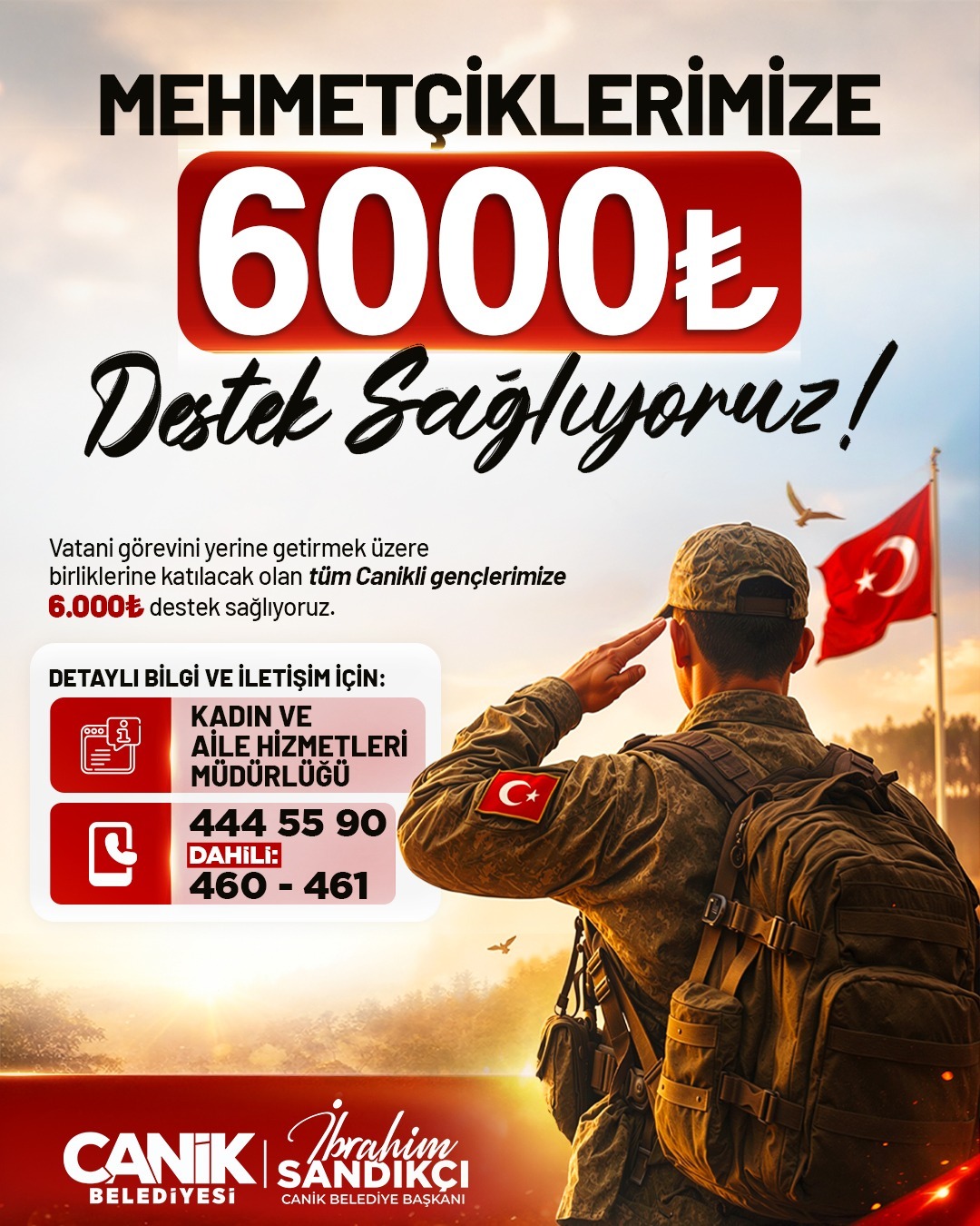 Öğrencilerden yeni evli çiftlere kadar geniş bir yelpazede destek programları yürüten Canik Belediyesi, "asker harçlığı" projesiyle Mehmetçik adaylarının ve ailelerinin bütçesine doğrudan katkı sunmayı hedefliyor.ŞARTSIZ 6 BİN TL DESTEK VE ASKER ÇANTASI