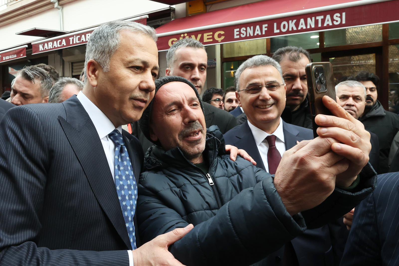 İçişleri Bakanı Ali Yerlikaya, Saathane Meydanı'nda esnaf ziyareti gerçekleştirdi. Bakan Yerlikaya, fotoğraf çektirmekte zorlanan yaşlı vatandaşların telefonlarını alarak selfie yaptı. Dükkânlara girerek esnafa 'hayırlı işler' dileyen Yerlikaya, iletilen talepleri not aldırdı.