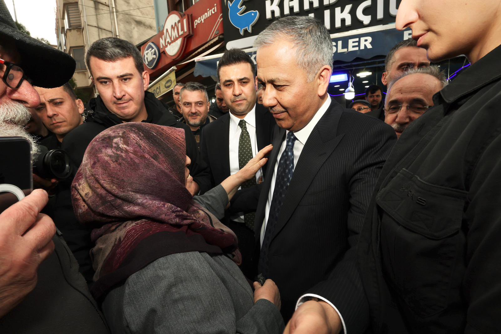 Bir emekli kadının maaşlarla ilgili talebini dile getirmesi üzerine Bakan Yerlikaya, kulağına eğilerek, "Mazlumu ortada mı bırakacağız, sizlerin gönlünü kazanacağız, görürsün bak" diyerek vatandaşlarla sohbetini sürdürdü.