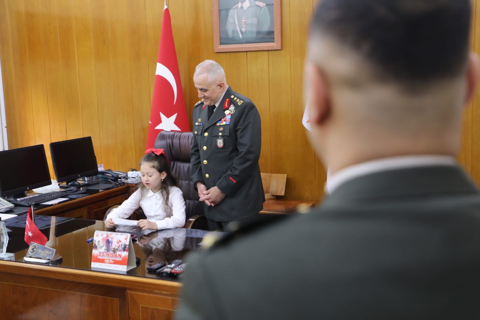 Makam koltuğunu öğrencilere bırakan ve onlarla sohbet eden Davut Ala, tüm çocukların bayramını tebrik ederek hediye takdiminde bulundu. Garnizon Komutanı Gazi Tümgeneral Davut Ala’nın makamına oturan İstiklal İlkokulu öğrencileri, 23 Nisan Ulusal Egemenlik ve Çocuk Bayramı nedeniyle hazırladıkları mesajda şu ifadelere yer verdi;SİZLERİN SAYESİNDE