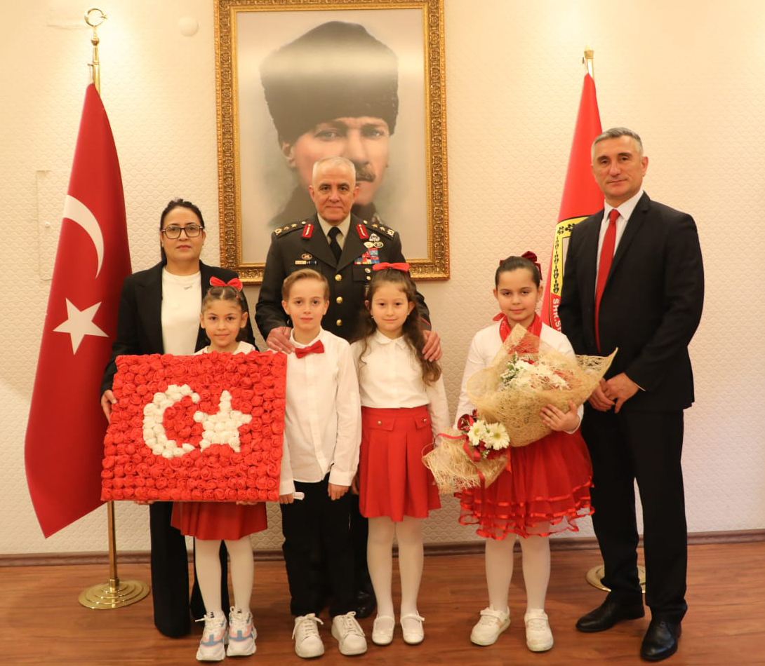 Samsun’un İlkadım ilçesinde bulunan İstiklal İlkokulu, 23 Nisan Ulusal Egemenlik ve Çocuk Bayramı nedeniyle Garnizon Komutanı Gazi Tümgeneral Davut Ala’yı makamında ziyaret etti.Okul Müdürü Sezai Tiryaki, sınıf öğretmeni Gonca Aksel, öğrenciler Zeynep Varol, Yağmur Yılmaz, Ömer Aydın ve Nur Sevim Ay’ın katıldığı ziyarette Garnizon Komutanlığı’nın şeref defterini imzalayan öğrenciler, Komutan Davut Ala’ya arkadaşlarının hazırladığı Türk bayrağını hediye etti.
