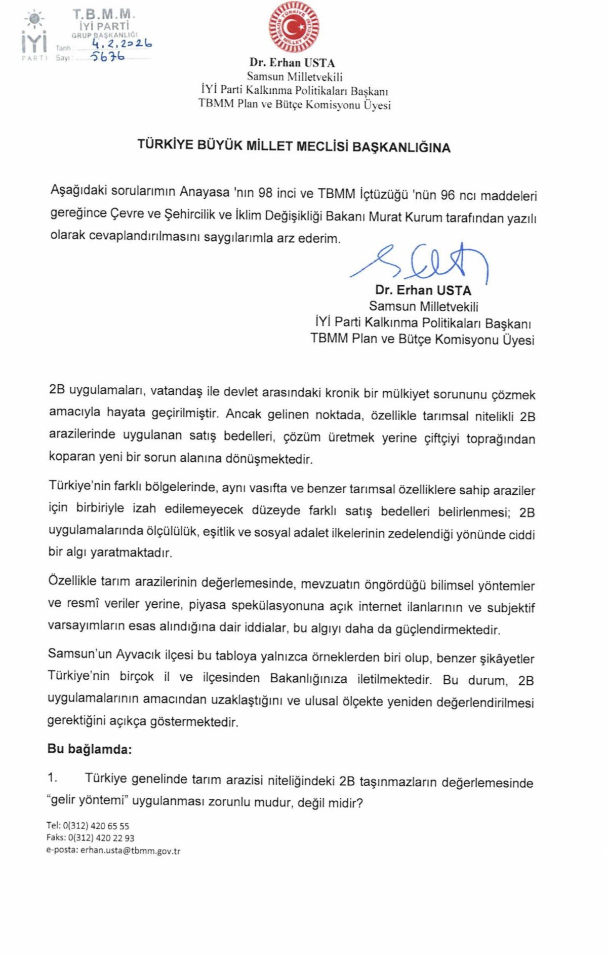 İYİ Parti Genel Başkan Yardımcısı ve Samsun Milletvekili Erhan Usta, 2B arazilerinin satış bedellerinde yaşanan adaletsizlikleri gündeme taşıyarak hükümete yönelik sert eleştirilerde bulundu. 2B uygulamalarının asıl amacının mülkiyet sorunlarını kalıcı olarak çözmek olduğunu hatırlatan Usta, mevcut fahiş fiyatlandırmaların çözüm üretmek bir yana, vatandaşlar için yeni ve içinden çıkılmaz mağduriyetler yarattığını savundu.