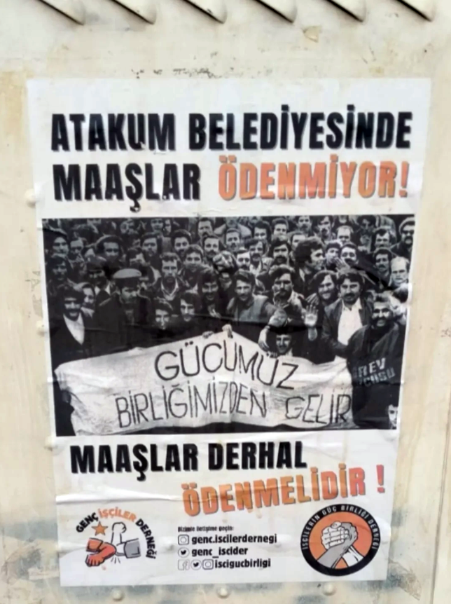 Diğer yandan kendilerini "Genç İşçiler Derneği" olarak tanımlayan bir grup, Atakum’un çeşitli noktalarına afiş astı. Atakum Belediyesi’nde "Maaşlar ödenmiyor" diyen grup, "Gücümüz birliğimizden gelir! Maaşlar derhal ödenmelidir" çağrısı yaptı.Atakum Belediyesi bünyesinde çalışan bazı işçilerin 3 aydır maaşlarının aksadığı, bazı çalışanların ise daha uzun süredir maaş alamadığı öne sürüldü.