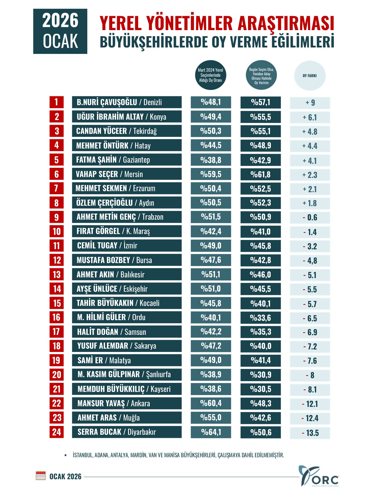 ORC Araştırma şirketinin Ocak 2026 yerel yönetimler anketinde oy eğilimleri açıklandı. 24 Büyükşehir Belediyesi'ni kapsayan anket çalışmasında 12 bin 900 katılımcı yer aldı.