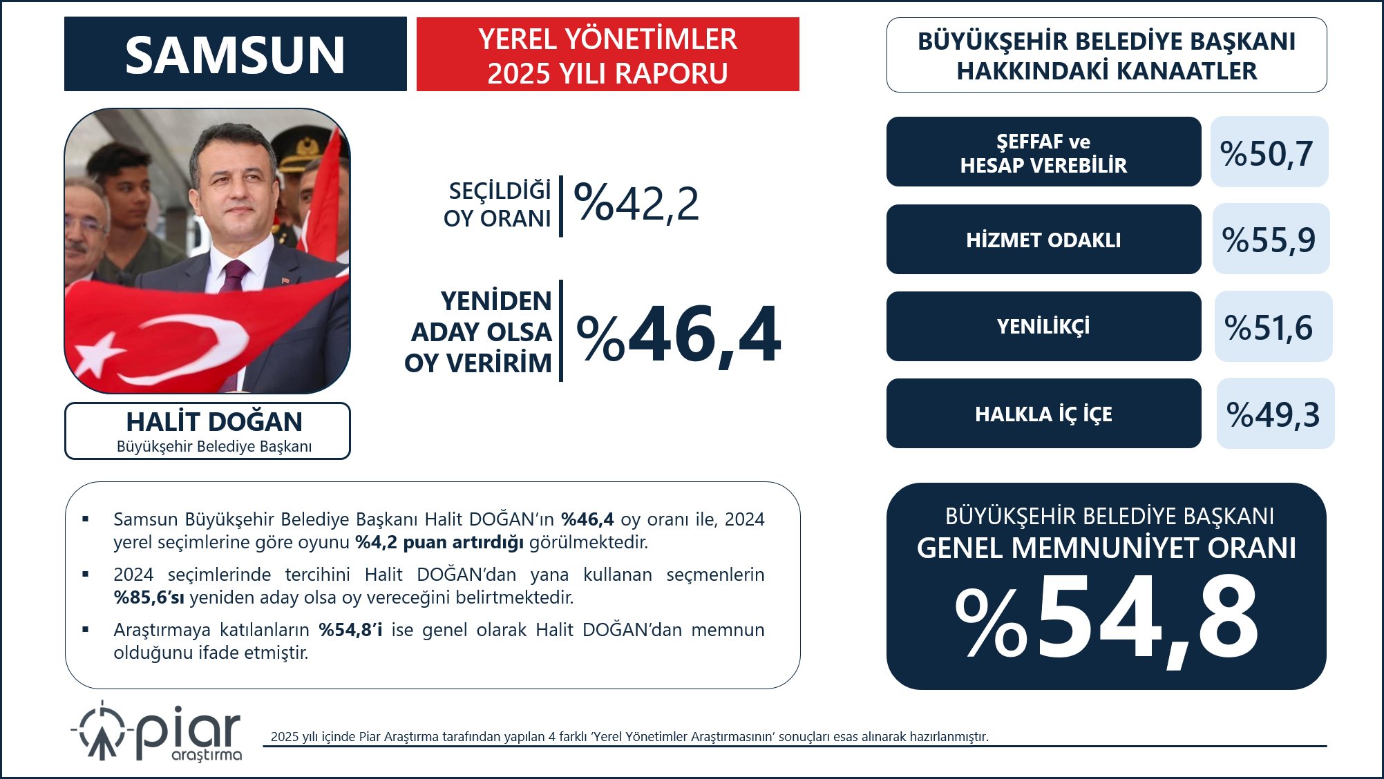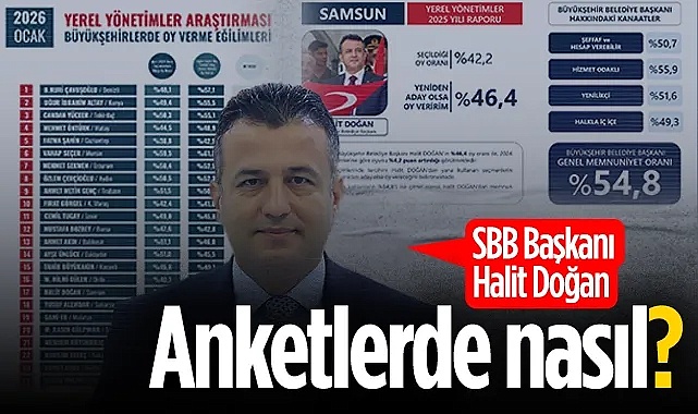 Piar Araştırma şirketinin Yerel Yönetimler 2025 Yılı Raporu’nda, Samsun Büyükşehir Belediye Başkanı Halit Doğan’ın performansı değerlendirildi. Ankete göre SBB Halit Doğan’ın 2024 yerel seçimlerinde seçildiği oy oranı yüzde 42,2, “yeniden aday olsa oy veririm diyenler” ise yüzde 46,4 olarak ölçüldü. Bu veriler 2024 seçimlerine kıyasla “+4,2 puanlık artış” olduğunu gösterdi.