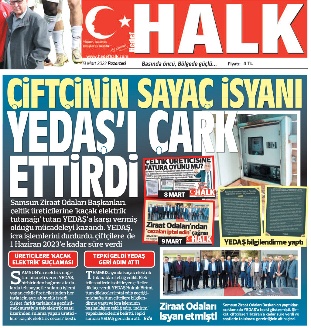 Samsun'da elektrik dağıtım hizmeti veren YEDAŞ, birbirinden bağımsız tarlalarda tek sayaç ile sulama işlemi yapan çiftçilerden her tarla için ayrı abonelik istedi.Şirket, geçtiğimiz Temmuz ayında farklı tarlalarda gezdirilmek suretiyle tek elektrik saati üzerinden sulama yapan üreticilere 'kaçak elektrik cezası' kesti. Tutanaklar çiftçilere tebliğ edildi. Samsun Ziraat Odaları Başkanları yaptıkları açıklamada YEDAŞ'a tepki gösterdi. İcra işlemlerinin iptal edilmesini gerektiğini söyledi.