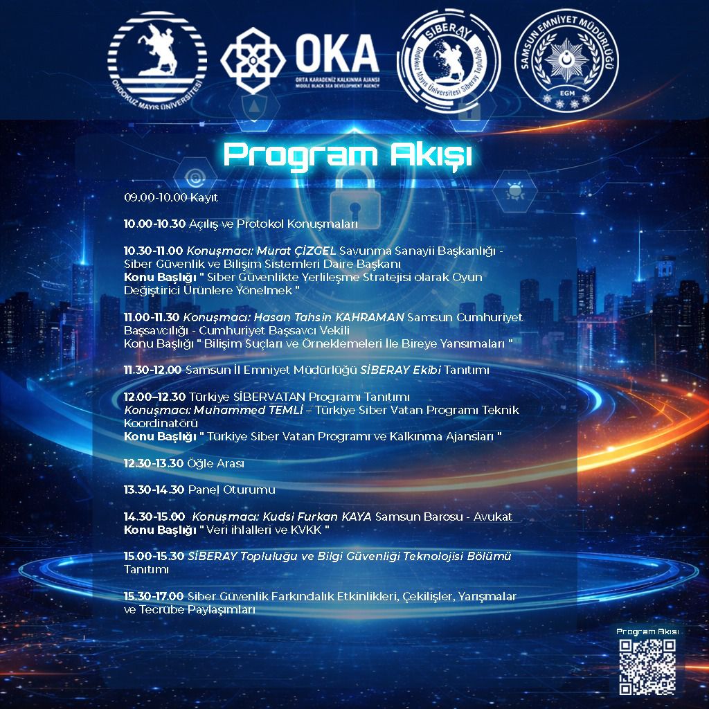 Projenin üniversite ayağını güçlendirmek amacıyla Ondokuz Mayıs Üniversitesi bünyesinde kurulan SİBERAY Topluluğu’nun tanıtımı ve açılışı, Samsun İl Emniyet Müdürlüğü ve Orta Karadeniz Kalkınma Ajansı (OKA) iş birliğiyle gerçekleştirilecek. Bu kapsamda 10 Şubat 2026 tarihinde OMÜ Atatürk Kültür Merkezi Büyük Salon’da "1. Samsun Güvenlik Zirvesi" düzenlenecek. Saat 09.00 ile 17.00 arasında sürecek zirve, siber güvenlik alanındaki paydaşları bir araya getirecek.