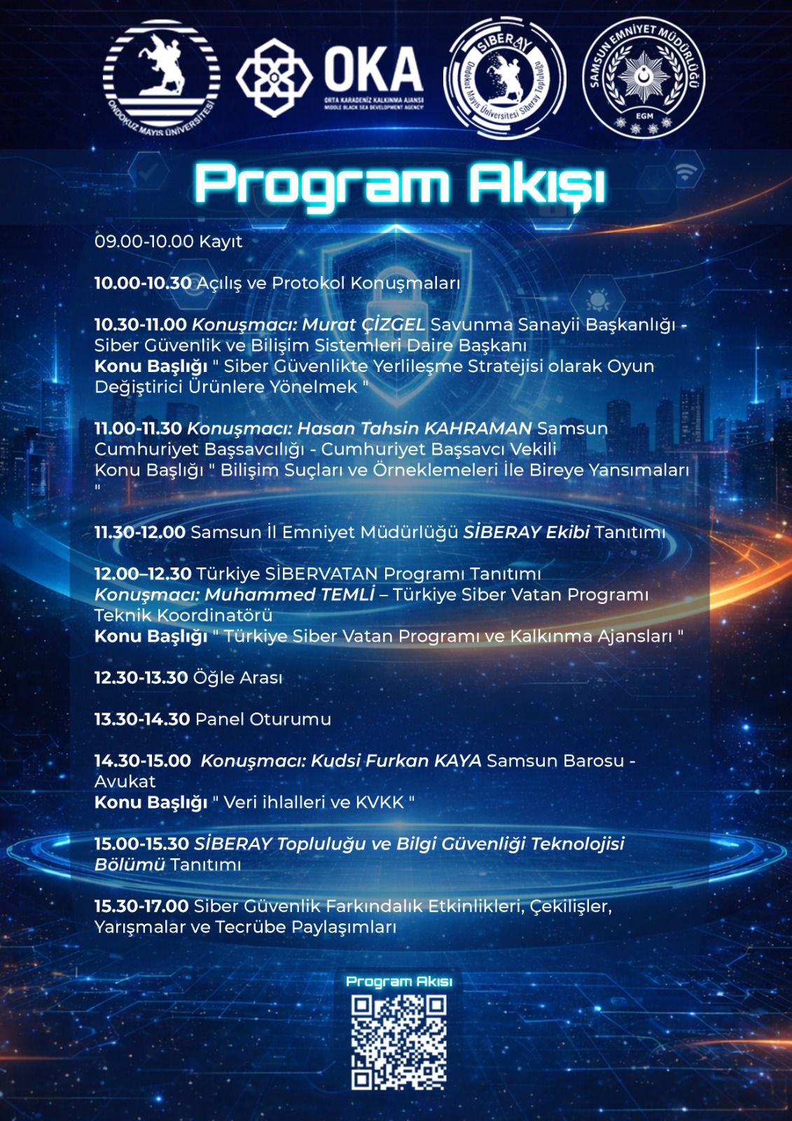 Zirve programı, siber güvenlik dünyasının önemli isimlerini konuşmacı olarak ağırlayacak. Savunma Sanayi Başkanlığı Siber Güvenlik ve Bilişim Sistemleri Daire Başkanı Murat Çizgel, Samsun Cumhuriyet Başsavcı Vekili Hasan Tahsin Kahraman, Batı Karadeniz Kalkınma Ajansı'ndan Muhammed Temli ve Samsun Barosu avukatlarından Kudsi Furkan Kaya gibi isimler bilgi ve birikimlerini paylaşacak. Ayrıca Samsun İl Emniyet Müdürlüğü ekipleri ve Üniversite SİBERAY Topluluğu üyeleri de sunumlarıyla programda yer alacak.