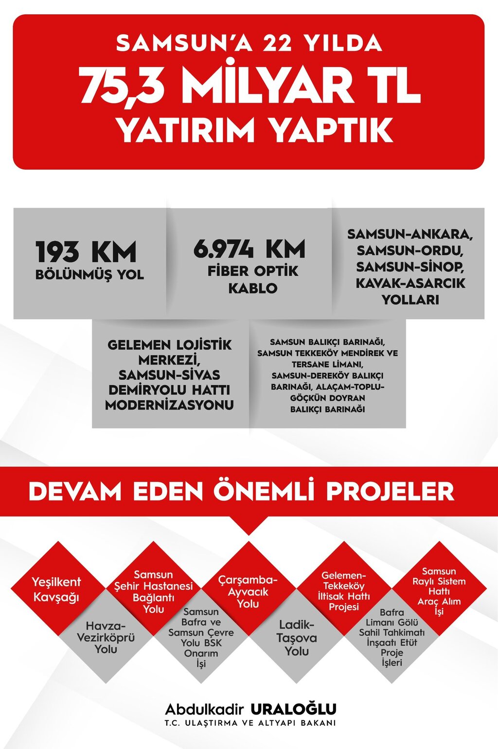 Ulaştırma ve Altyapı Bakanı Abdulkadir Uraloğlu, 'Samsun İçin Her Daim Birlikte Özümüzden Geleceğe Türkiye Buluşmaları'na katıldı.Uraloğlu, AK Parti hükümetleri döneminde Samsun'a hava yolu, demir yolu, kara yolu, iletişim ve denizcilik noktasında 75 milyar liranın üzerinde bir yatırım yapıldığını söyledi.Samsun Havalimanı'nı genişletmek istediklerini anlatan Bakan Uraloğlu, "Dış hat uçuşlarında pandeminin neredeyse 2 katına kadar çıkmışız. İç hat uçuşlarında pandemi zamanındaki yakalamışız. Demek ki iç hat uçuşlarında biraz daha gayrete ihtiyacımız var. Havalimanının belli ihtiyaçları var, proje yaptık. Ödenek tahsisi noktasında gayretimiz var. Onu temin edebilirsek oranın genişletilmesiyle ilgili bir işlem içerisinde olacağız" dedi.